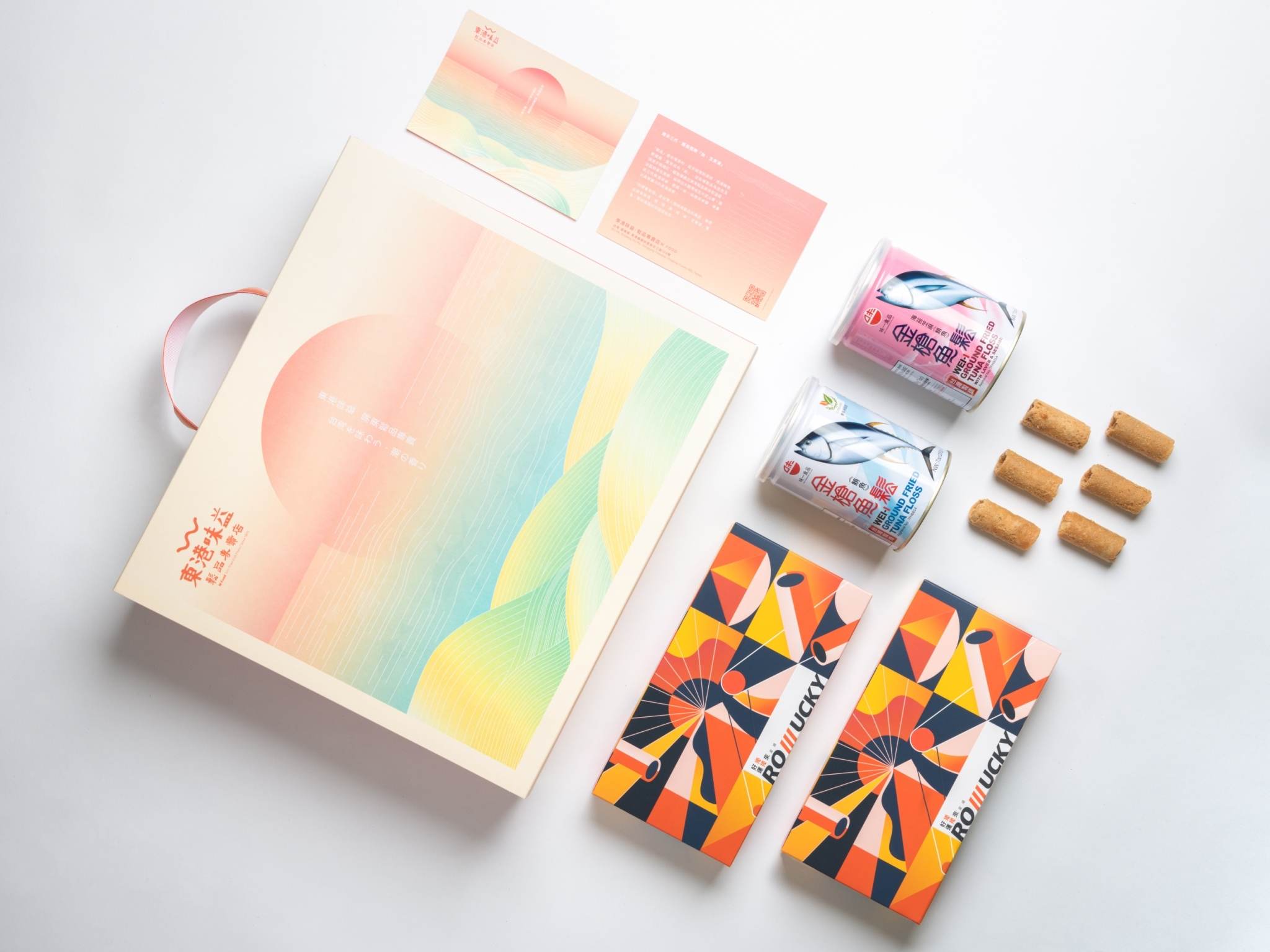 「鬆品」是台灣漁村,從未缺席的美味,透過鮪魚鬆纖維,匯聚成為「絲」,淡粉橘鬆品為底色及漁港夕陽嫣紅,暖色傳遞出東港鬆品美味和溫暖,淡藍綠黃色漸層,延伸出大鵬灣域及大武山景,傳承三代東港味益,透過一絲一絲構成串聯,堆疊出具有層次的東港美學。