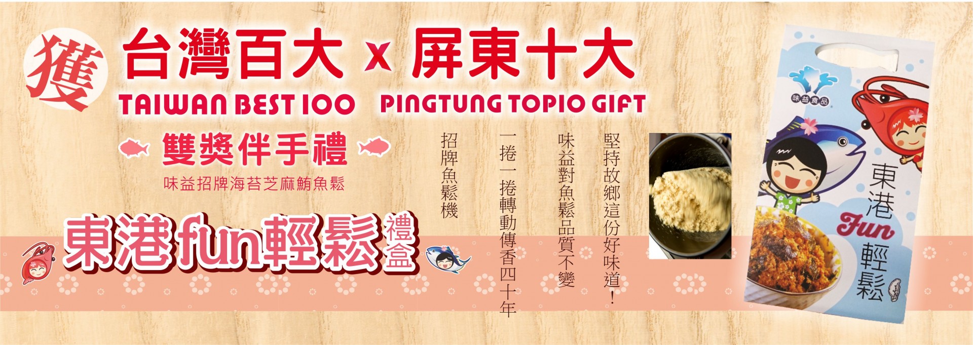 榮獲➤屏東十大伴手禮 ➤台灣百大伴手禮 雙獎 ➤尾牙春酒企業年節最佳伴手禮 以歐盟認證魚鬆工廠嚴格製作, 拌炒細綿鮪魚 再融入香氣十足芝麻與海苔 海味入口好禮極品!